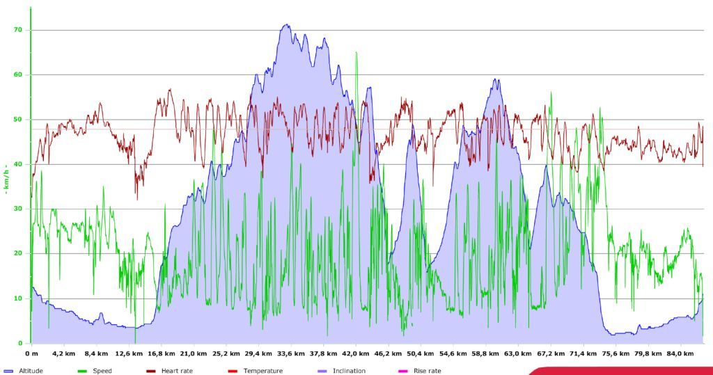 Tak jsme se po dlouhé době domluvili (alespoň část týmu) na společném celodenním cyklovýletu. Ve složení Mira (Klvač), Michal, Tomáš, Pája a já jsme ráno v 9:15 (čekalo se na Páju J) vyrazili z Otrokovic od Miry. Cílem byl hrad Buchlov. A výlet se vydařil. Počasí bylo naprosto bikové. Pád i defekt nás potkal (tedy přesněji pád do ostružin mě a defekt Tomáše). Zvolené tempo bylo volnější bo já jsem jen turista a takové výšlapy jsem zatím neabsolvoval a navíc jsem jel krajinou, kterou jsem viděl absolutně poprvé. V grafech níže je naše trasa rozdělena na čtyři etapy. První a poslední je vlastně stejná, liší se akorát v průjezdu kolem Salaše (tam MODRÁ, zpět ČERVENÁ) a start (nebo cíl) je až ve Zlíně bo já zaznamenával cestu až domů. Celkem to vychází na nějakých 87km (samotný výlet tedy cca 65km).